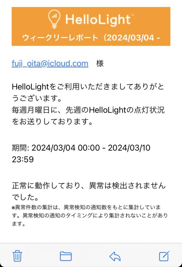 24時間ライトが点灯している、または24時間消えたままになると登録したアドレスにメールが届きます。安心度はS〇C〇Mさんには及びませんが、何よりも利用料が格安です。